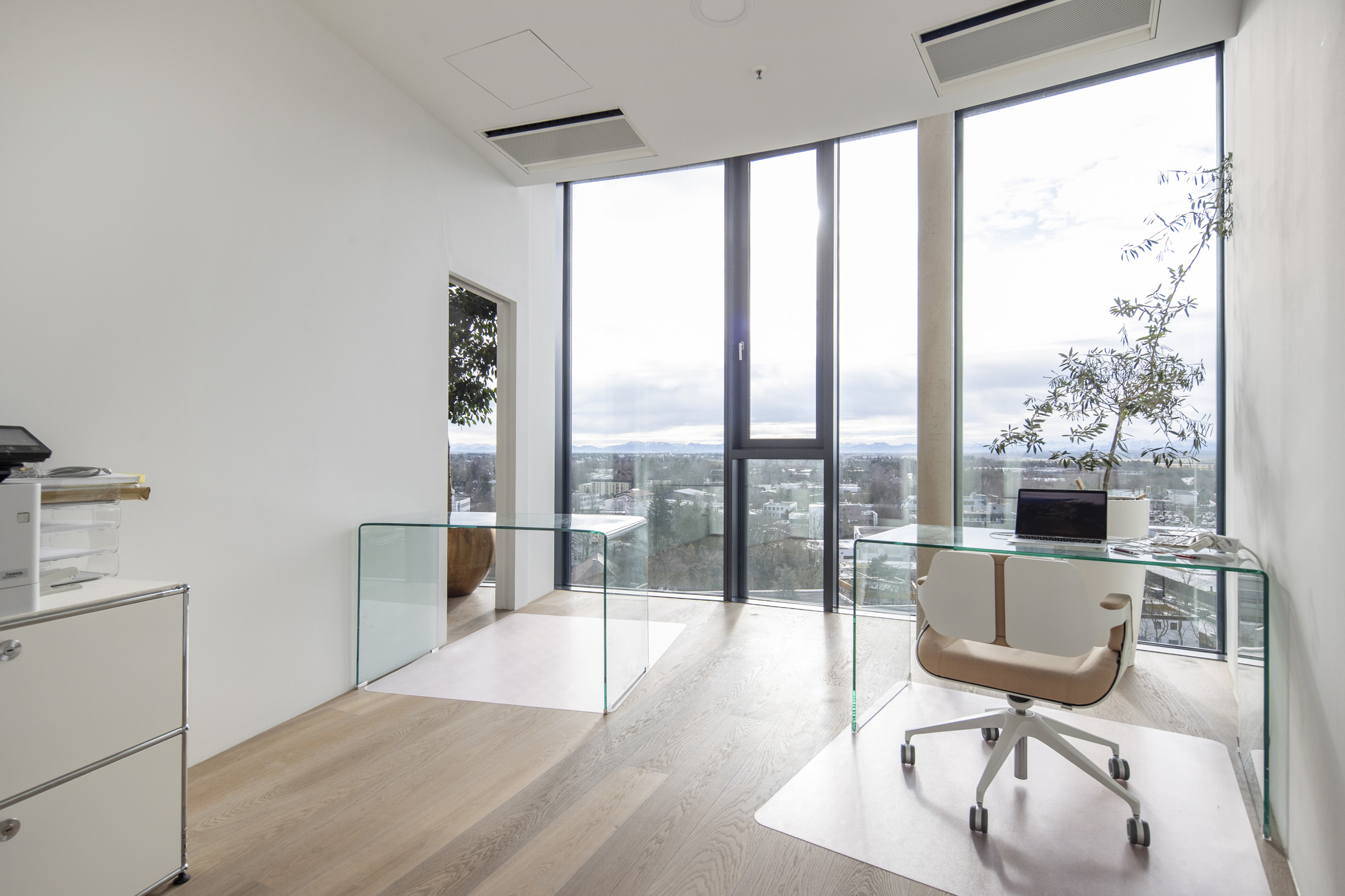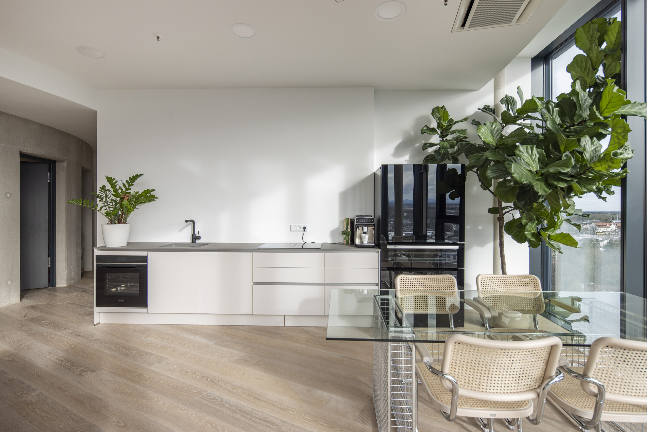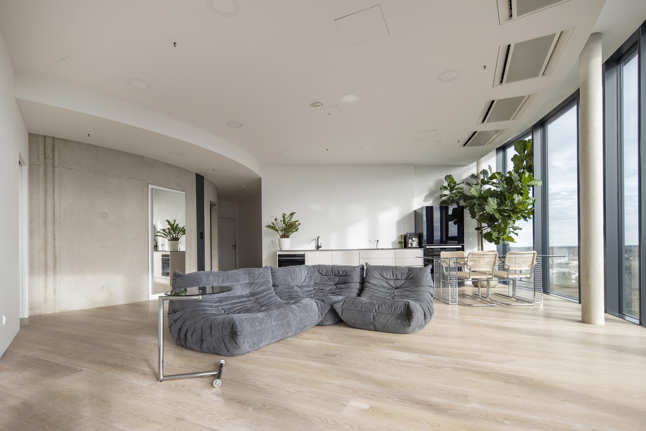 Im 10. Stock ist eine für alle Mieter nutzbare kleine Skylounge mit eigener Dachterrasse eingerichtet.
