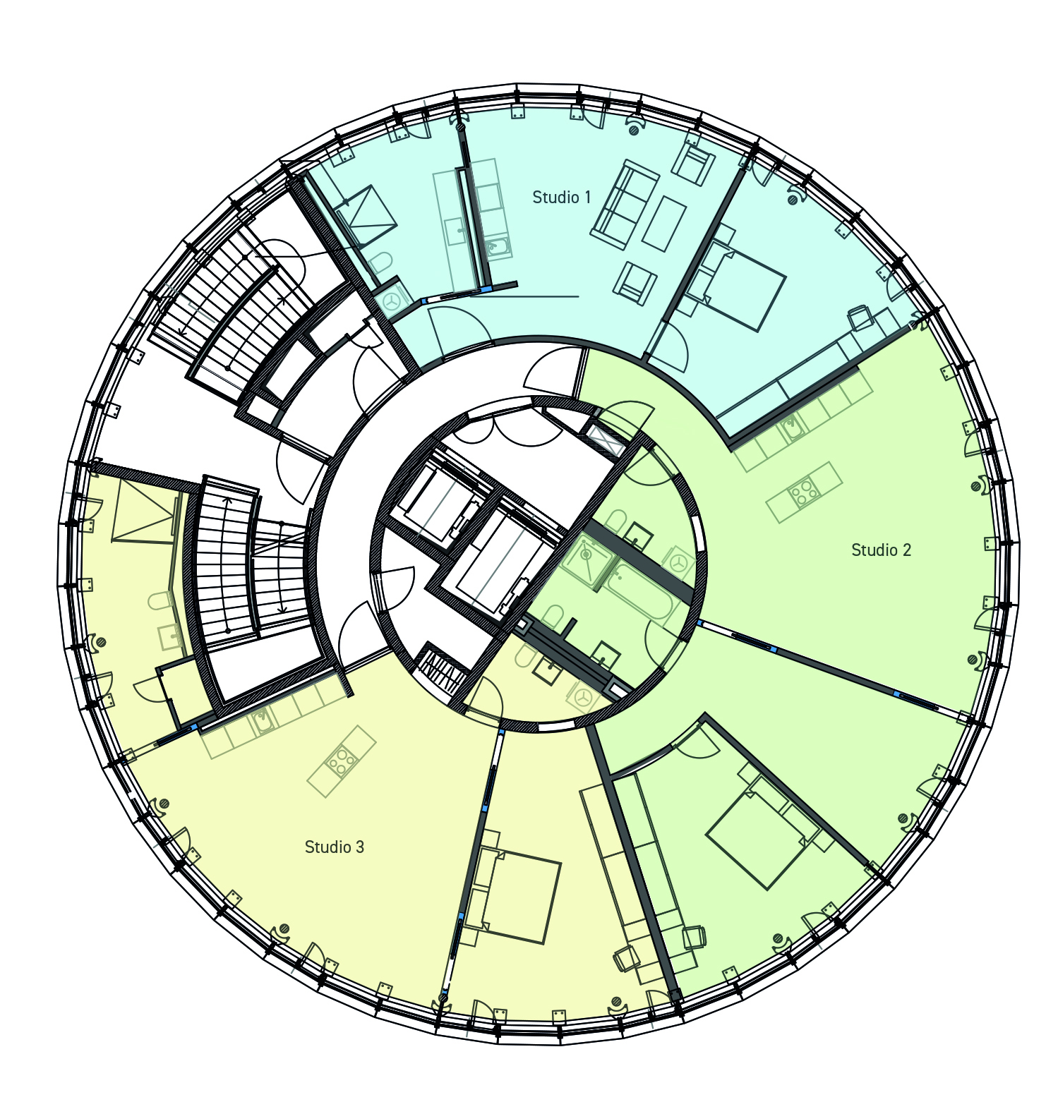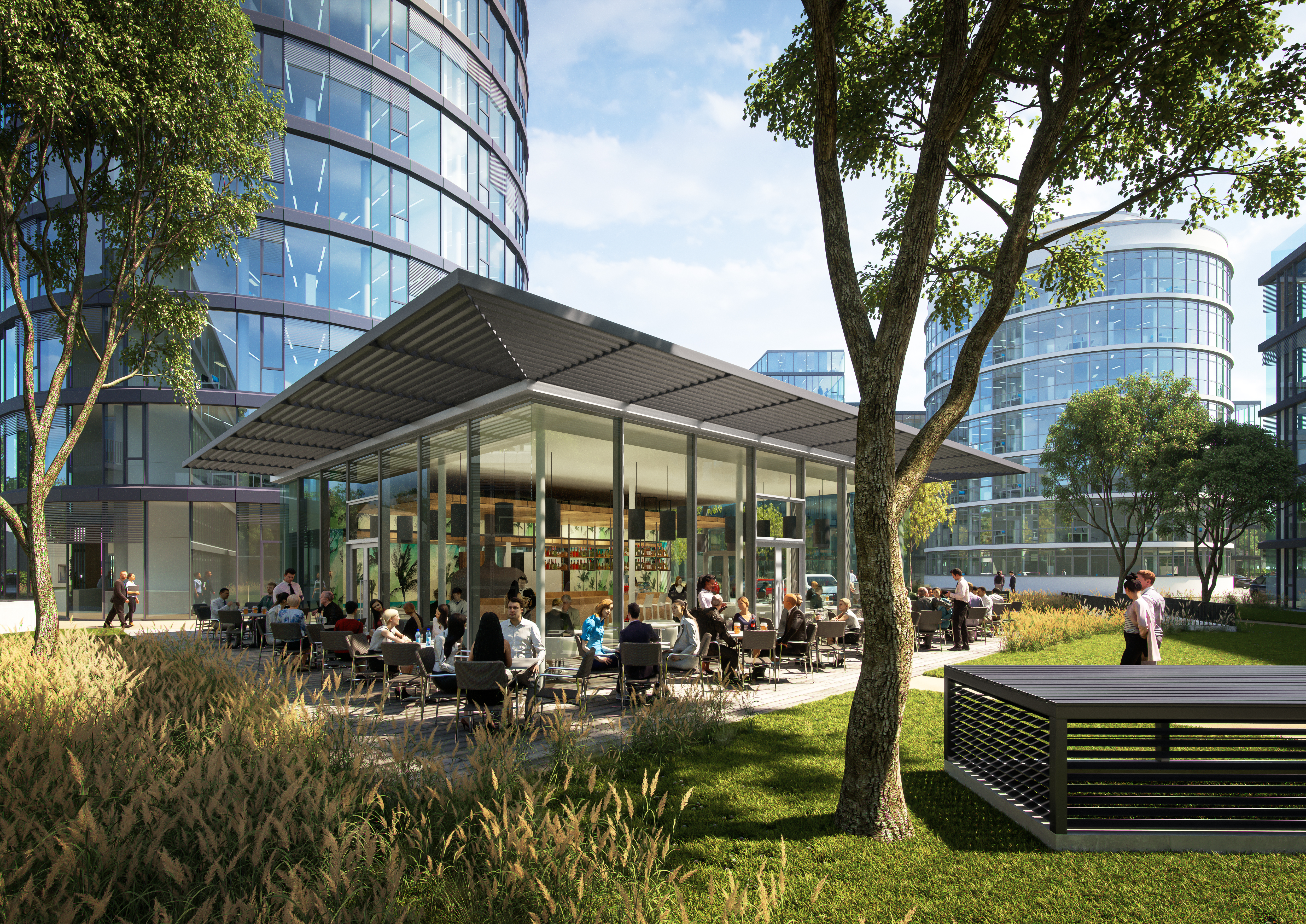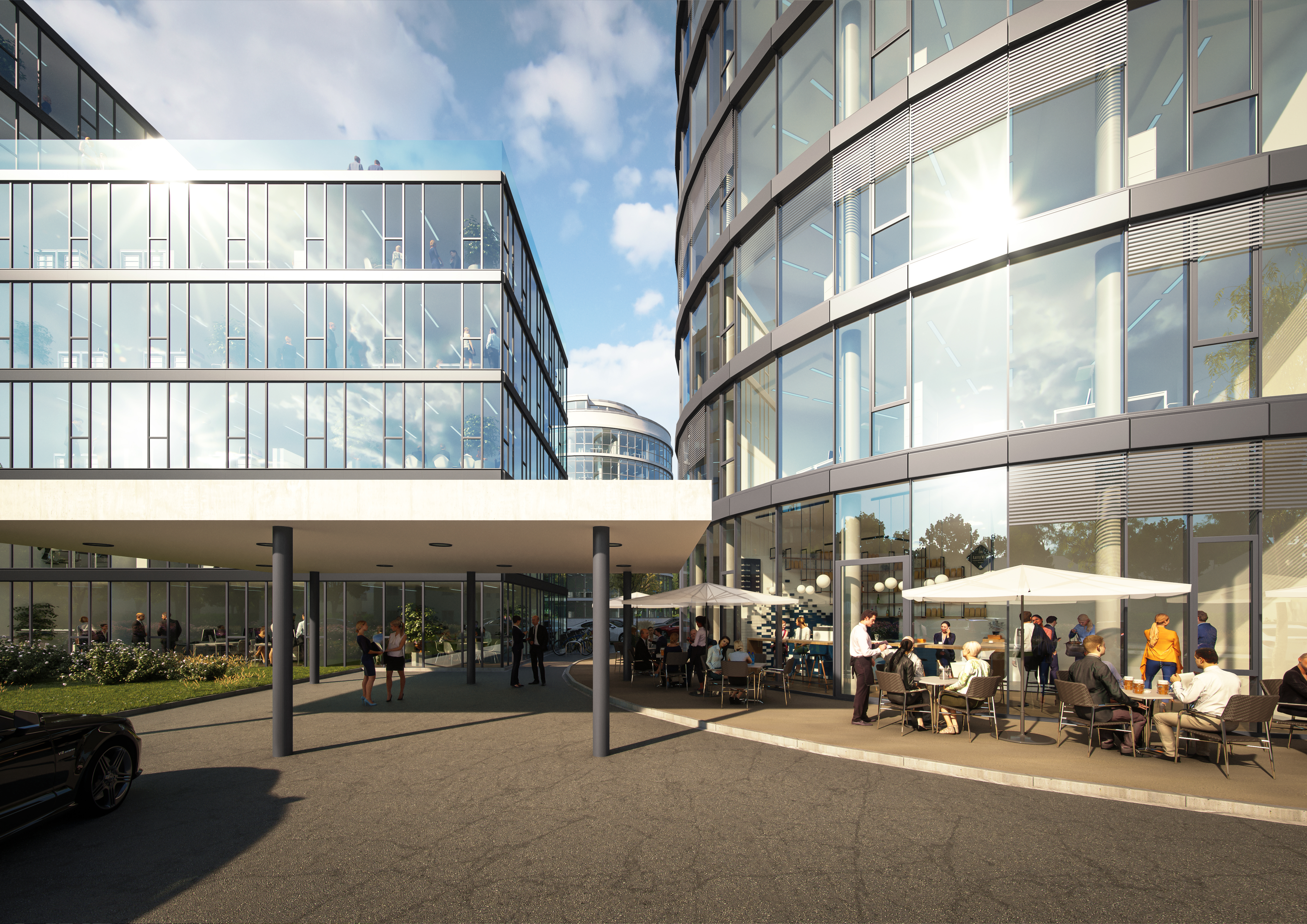 Im Erdgeschoss des Turms gibt es eine Tagesbar/Café und im Innenhof wird der Gastronomie-Pavillon für ein gastronomisches Angebot sorgen.