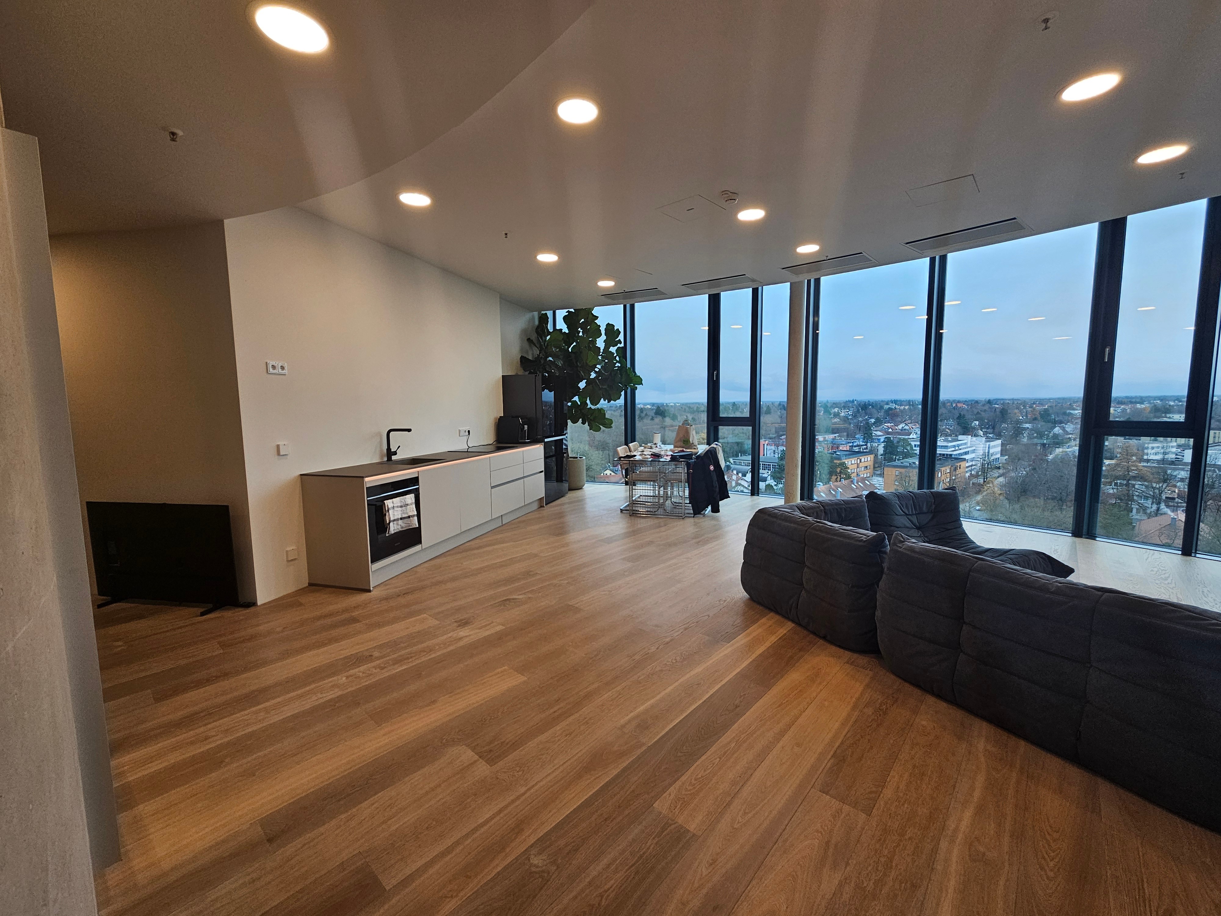 Der Innenausbau der Büroflächen wird hohen Qualitätsansprüchen gerecht, und die flexiblen Grundrisse ermöglichen unterschiedlichste Bürokonzepte. Im 10. Stock ist eine für alle Mieter nutzbare kleine Skylounge mit eigener Dachterrasse eingerichtet.
